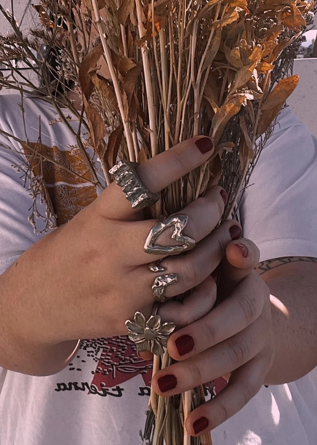 Diseño inspirado en las formas de la montaña, con relieves que recuerdan a una cordillera. Cada pieza se modela en cera y se funde en alpaca, logrando un anillo con carácter propio y un acabado artesanal.